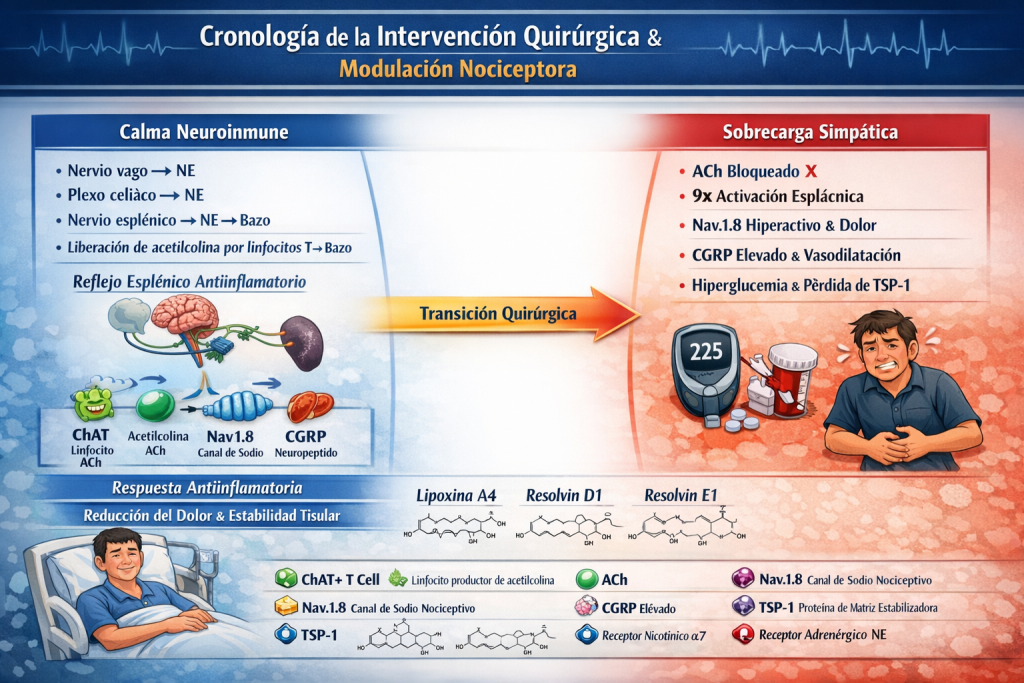 La respuesta al estrés requiere de la interacción aferente sensorial del sistema nervioso, células T, reprogramación metabólica y mitocondrial y de señalización purinérgica central. El nervio vago es fundamental en determinar el balance entre el microambiente tópico dañado y las señales de seguridad vagal que provienen del cerebro y en emitir lejanas señales de seguridad que viajan al plexo celíaco y al nervio esplénico, a pesar de la escasa innervación colinérgica en y hacia el bazo. Pero mediante una neurona preganglionar esplácnica y luego una posganglionar simpatética en la contextura del plexo celíaco, se logra la conexión física adrenérgica. Sin embargo, la sola estimulación del nervio esplénico (fibras noradrenérgicas) que se proyecta al bazo no activa potenciales liberadores de acetilcolina. Es la liberación de norepinefrina de las terminaciones adrenérgicas en el bazo que activa, en las células T cercanas a las terminaciones del nervio esplénico y en los linfonodos, a los receptores adrenérgicos de estas células T. Estas expresan la enzima colinacetiltransferasa (ChAT) para inducir finalmente la producción de acetilcolina. A su vez, está activa a los receptores nicotínicos acetilcolina 7α (nAchR7α) expresados en los macrófagos y en las células dendríticas, lo que inhibe la dominante producción del factor de necrosis tumoral (TNFpssi) y el grupo B1 de proteínas de alta movilidad (HMGB1), típica del bazo16. Son los linfocitos sintetizadores de acetilcolina los que proveen un puente no neuronal para completar el sendero que conecta funcionalmente al nervio vago con el bazo. De esta manera, se crea un marcado microambiente neuroinmune antiinflamatorio y de resolución (mediadores lipídicos de resolución SPMs pssi). O sea, el sendero colinérgico antiinflamatorio (CAP pssi), que genera el sentido de seguridad, y el cual, si bien es subconsciente (neurocepción), es cuantificable mediante la arritmia respiratoria sinusal y la variabilidad entre latidos del ritmo cardíaco, advertible por otros aun si el cliente no gustara manifestar su estado de bienestar (escuchado en la voz prosódica y visto en el relucir de los ojos); más es garantía de salugénesis18.